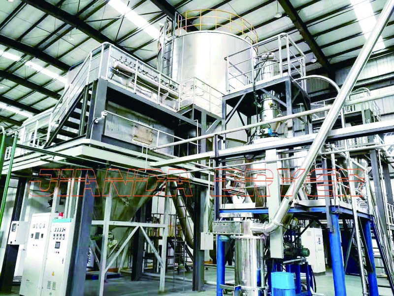 此套聚合硫酸铁专用喷雾干燥机包含干燥、收料、尾气处理、辅助等系统,在干燥主塔的热风分配器的设计上,为了能够在主塔中达到最佳的热风分布,并可减少粘壁现象和强化干燥,我司将其角度设置为可调节。在设备材质上,与产品或尾气接触部分采用不锈钢,支架、法兰等均为碳钢。