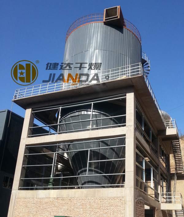 干燥介质空气经过直燃式天然气热风炉加热后,通过高温亚高效过滤器过滤后,经由干燥塔顶部的热风分配器进入塔内;需干燥的物料由高压泵送入塔顶喷枪,在压力的作用下形成细小的雾滴。在干燥室内热风与雾滴群接触水分蒸发干燥成干粉,干粉通过主塔及二级旋风分离器收集。