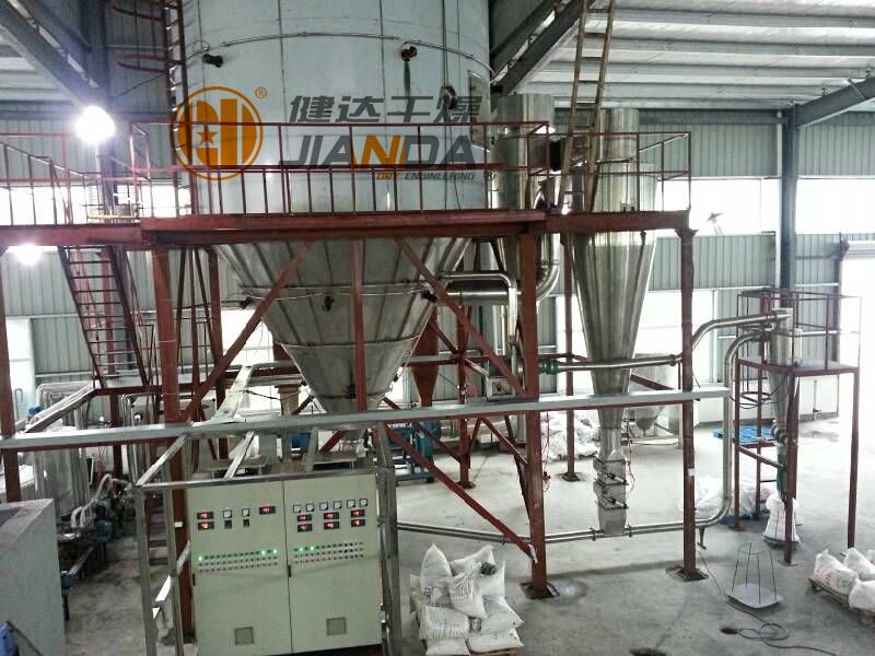 环境对于发酵液的影响至关重要,因此在发酵液的干燥问题上,我司也尤为看重。结合了客户的要求及物料本身的特性,我司设计制造了专门针对该司的非标喷雾干燥机。该设备核心干燥系统由热风分配器、干燥主塔、观察人孔、塔内照明装置、气动敲击锤等组成。在雾化器的选择上,由于电动高速离心雾化器转速无级可调,我司采用电动雾化器代替机械雾化器,客户可根据所干燥的物料的特性,选择最佳转速。产品收集上,我司在主塔锥体结构上安装气动敲击锤,采用了日本清新分体技术,既能确保振击效果,降低了敲击时产品的噪音,又做到了分布合理。为了设备在使用过程中的便利操作,我司还在干燥塔合适位置装有清洗门、观察视镜和照明灯。