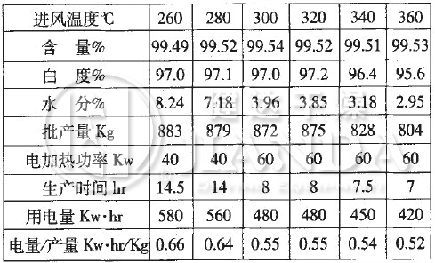我们进行了分组试验,取相同的样本量,不同的进风温度进行试验。其中进风温度分布为:260℃、280℃、300℃、320℃、340℃、以及360℃。样本的含水量14.05%,白度为96%。出风温度设定为95-105℃。